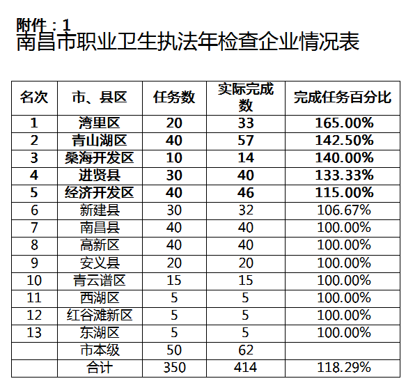(一)下達檢查企業(yè)任務指標均完成。按照《南昌市“工作場所職業(yè)衛(wèi)生監(jiān)督執(zhí)法年”活動實施方案》的要求,對各縣區(qū)下達的任務均能認真有效完成,其中灣里區(qū)、青山湖區(qū)、桑海開發(fā)區(qū)、進賢縣、經(jīng)開區(qū)、新建縣六個縣區(qū)均超額完成任務。